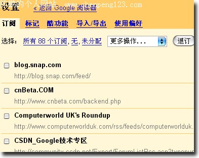 “正在加载”的截图:左侧栏:设置: 从中文版中可以看出, Google Reader的中文官方名称为Google阅读器。很多人不使用Google Reader是因为没有中文版,现在呢?PS.如果你没有看到中文版,把Google服务的语言设置为中文,重新登录