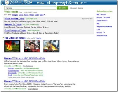 今天的Searchification上,微软向公众第一次展示了Live Search 2.0的部分内容,包括在搜索相关性上的重大突破,Nadella描述Live Search2.0时这样说道:”就相关性而言,我们现在和Google并驾齐驱,领先Yahoo”Live Search2.0在手机和地图搜索上有了巨大的改进,并且注重一些关键内容的搜索相关如:健康,购物,娱乐等。 在接下来的几周里,一些新的搜索特征的元素会出现,首先就从相关性的改进上开始。其中2个令人印象最深刻的特色是Live Maps上具有重要意义的改进,包括拥有了鸟瞰图像Live Maps 3D,并且可以捕捉和保存3d”tours”,而一些手机上的新元素会在接下来的几周里告诉大家。 在这个搜索结果页面中,搜索条目是”Heroes”,搜索结果给人简洁明了的感觉。最上面的视频是原版,以及一些链接到官方网站和相关站点,当然这些截图很难体现内容。而预览视频这一项,则是所有改进中最显著的地方。