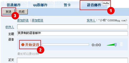 1、什么是QQ邮箱语音邮件? QQ邮箱语音邮件,是语音和邮件的结合,可以让您的声音通过邮件传递,邮件不只是单纯的文字和图片了,还能听到对方的声音。 2、使用QQ邮箱语音邮件需要什么配置? 使用语音邮件非常简单,无需特别配置,也不用安装特殊软件,您只需要一个麦克风就可以完成整个录制了。 (录制和播放语音需要Flash支持,请确定您的Flash已经升级到最新版本) 3、如何使用QQ邮箱语音邮件? 直接在邮箱首页录制(最长可以录制30秒的语音)