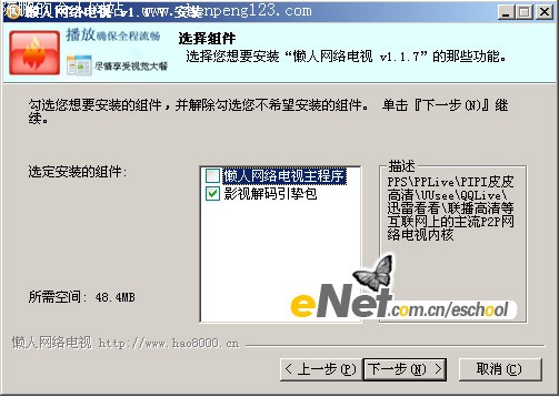 由于懒人集成了众多的影视点播平台,所以它的身材比较肥胖一些,主程序仅3M,而这些影视解码引挚包却达到了进50M的空间,可真够雷人的 -_-