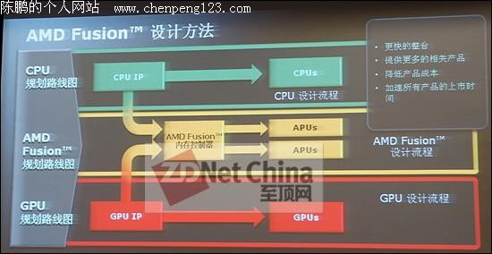 AMD融聚技术产品设计方法,在设计之初就将CPU的IP核与GPU的IP核进行统一的考虑,并通过新一代的统一融聚内存控制器来满足具体的数据请求带宽,并设计出最终的APU