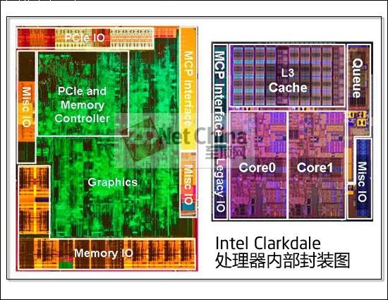英特尔目前已经推出了集成GPU的32nm的Clarkdale处理器(隶属Westmere家族),它通过MCP(多芯片封装)技术,将CPU单元与GPU单元封装在一起,但并不是在一块晶圆上原本设计的,而从内部的结构来看,内存控制器移到了GPU单元上,GPU与CPU采用MCP接口相连,显然这与AMD的APU设计理念完全不同,这种设计虽然保证了GPU的效率,但对于CPU的性能将会产生较大的影响,这也就是“非原生”设计的一大弊病,并不能充分发挥CPU与GPU整合的威力。英特尔推出这款产品的本意其实更注重于平台成本的节省,而不是性能的提升