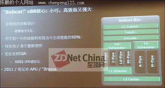 下面为大家介绍一下Bobcat,Bobcat这种核心非常小巧、高效,而且功耗非常低,能够在低于一瓦的情况下工作。Bobcat以不到目前处理器核心一半的面积实现了当前主流处理器90%的性能。这款核心将在2011年随着我们代号为Brazos的笔记本APU问世而同时问世。它的设计非常灵活,高度可合成,可重新组合CPU使用。