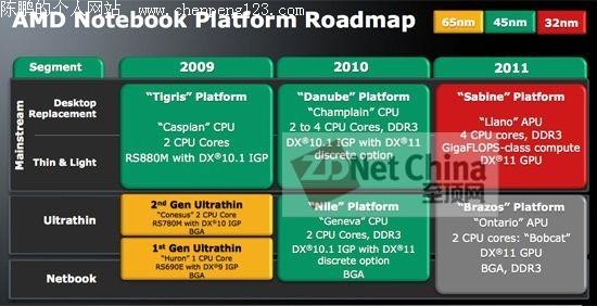 我们可以从以上两张图上能看出AMD APU的发力点,2011年将在高端桌面市场推出基于Bulldozer核心的Scorplus平台,届时的CPU成品代号Zambezi,而在主流桌面市场将推出Lynx平台,采用的就是LIano处理器,而在高端的笔记本电脑市场,将推出Sabine平台,采用的也是LIano APU,在超轻薄与上网本市场上则推出Brazos平台,采用的也是APU,代号为Ontario,CPU核心就是Bobcat。不过我们还不清楚LIano所采用的CPU核心(共4个核心)还不知道具体的版本,很可能是现有的Phenom核心的演进版