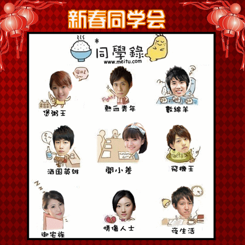 一个寒假不能总"宅"在家中,赶紧呼朋唤友聚一聚。话说本来一群天天黏在一起的兄弟姐妹们,都被高考的洪流冲到了四面八方去求学,一年聚会一次实属不易,总得拍照合影留恋下。不过单是相机"卡擦"一下的合影太普通,这不,我花了点心思用美图软件精心"捣鼓"了一套摇头娃娃版个性同学录,不仅搞笑幽默,而个性十足哦!