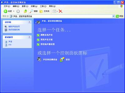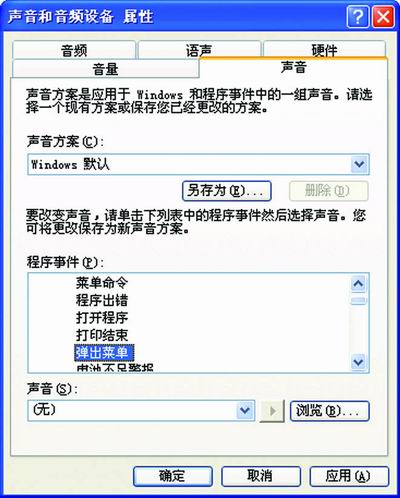 有关声音的设置,先要打开Windows控制面板的声音方案文件夹(见图1)。在“开始”菜单,选择“控制面板”“声音、语音和音频设备”。然后屏幕显示出有三个任务的列表。选择第二行“更改声音方案”。于是,“声音和音频设备属性”窗口打开,并且显示在“声音”标签上。