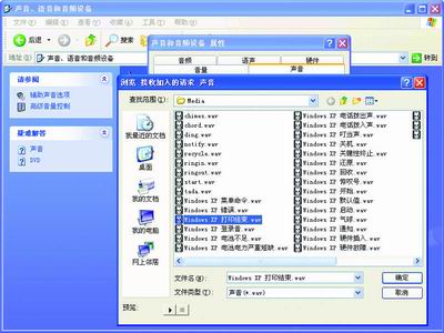 用声音控制面板可以把任何喜欢的声音文件(保存在硬盘里任何地方)指定给Windows里的某个事件。点击要更改的事件,然后点击旁边的“浏览”按键打开文件浏览器。现在可以寻找并选择硬盘上的任何wav文件。选好文件后还可以按左下方“预览”旁边的播放键试听一下。如果对选择满意,点击OK,该事件的声音即设置完毕(见图5)。