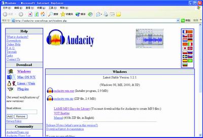 获得声音最简单的办法就是从网上下载。在互联网上有众多的免费下载短wav文件的网站,足以让你挑花眼。如果想用电影或电视剧里的片断,http://funwavs.com是个好地方。而www.wavcentral.com这个网站中可选的东西更多,范围更宽。不幸的是,这里都是MP3格式,所以你还要用一个音频转换软件把它们转成wav文件,然后才能用作系统声音。比如Audacity,它可以从下面网站上下载:http://audacity.sourceforge.net/windows.php(见图6)。由于涉及MP3文件,可能你还需要从下面的网站下载Lame MP3编解码器:http://mitiok.free.fr。