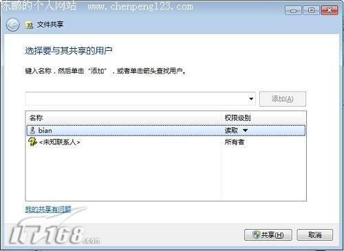 最后,按照常规方法设置共享文件夹,不过还要指定特定用户进行共享,这样就能实现Windows 7和XP、Vista等系统之间的网络共享了。