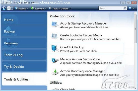 我们是怎么来建立这个一键还原的隐藏分区的呢?这个隐藏分区在中称为Acronis Secure Zone。我们可以先运行Acronis True Image Home 2010,然后在左侧点击“Tools@Utilities”(工具和组件)按钮(如图1)。