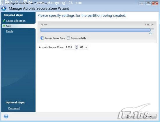 需要注意的是该分区要有足够的空间来建立隐藏分区),点击“Next”按钮;这时,我们就可以通过滚动条来设置Acronis Secure Zone的空间了,设置成足够保存备份的文件就行了(如图3)。