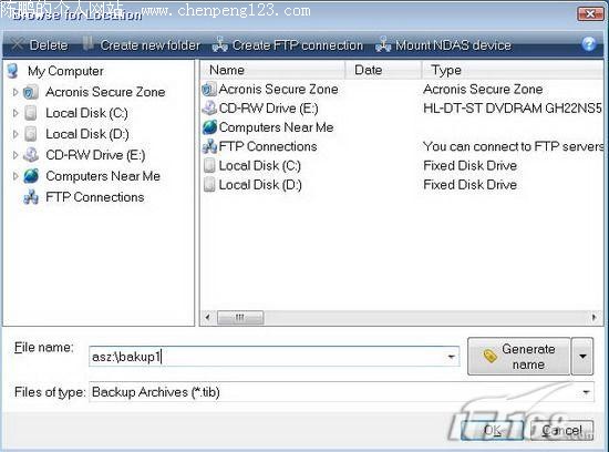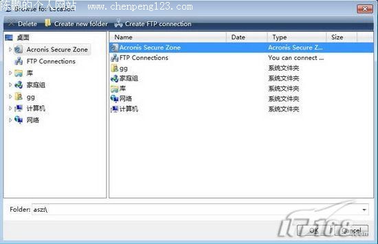 然后在弹出的选择位置的窗口中选择“Acronis Secure Zone”(如图6)就可以将系统备份在隐藏分区了,接着按照提示即可在Windows中备份完成;不过,这样的备份方式需要较大的隐藏分区的空间,我们还是更倾向于另一种备份方式。