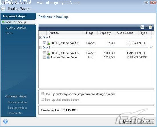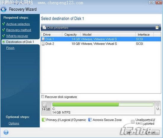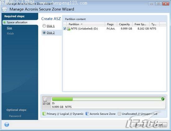 接着点击“Manage Acronis Secure Zone”(管理Acronis Secure Zone);这时进入了“Manage Acronis Secure Zone Wizard”(管理Acronis Secure Zone向导)窗口,我们需要首先选择建立Acronis Secure Zone的空间的来源分区,这里我们选择Disk2(第二硬盘)的第一分区,勾选该硬盘的分区即可(如图2)。