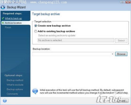 点击“Next”按钮;接着,我们在“Target selection”(目标选择)下选择“Create new backup archive”创建新的备份文件(如图12)。