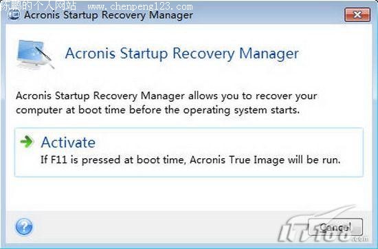 另一种备份方式是在非Windows环境——Acronis True Image Home 2010的启动环境下进行的。我们首先需要开启(启动恢复管理器),还是在左侧点击“Tools@Utilities”(工具和组件)按钮,接着点击Acronis Startup Recovery Manager按钮,在弹出的窗口点击“Active”按钮即可激活了(如图7)。