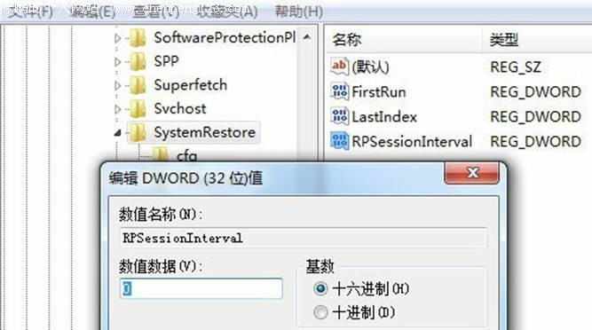 运行注册表,依次展开到如下分支:HKEY_LOCAL_MACHINE/SOFTWARE/Microsoft/Windows/NT/CurrentVersion/System/Restore。接着在右侧窗口中找到并双击“RPSessionInterval”,在弹出窗口中可以看到系统默认是“0”(单位:秒,十进制),如下图所示。