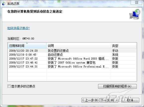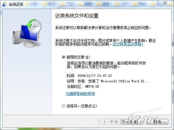 首先Windows 7的系统还原功能会默认选择系统所推荐的还原点,并告诉你该还原点的创建时间、说明等,让你对系统的推荐有所了解。当然,我们也可以“选择另一还原点”,自己来选择需要还原到哪个状态。