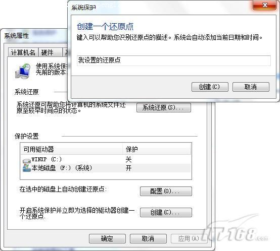 当对某个分区设置了保护功能打开后,Windows 7就会在必要的时候自动创建还原点。当然,此时我们也可以手动创建一个还原点,方法是在上图的界面中,点击最下方的“创建”按钮,填入还原点名称后,稍等片刻即可完成还原点的创建。