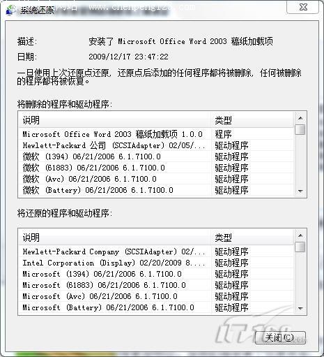 Windows 7的系统还原相较于XP系统中的还有一个很大的改进,就是可以扫描每个还原点的所影响的程序。当我们选中某个还原点后,点击“扫描所影响的程序”按钮, 稍等片刻即可得到详细的报告,其中包含了将删除和将还原的程序和驱动程序等。这个功能有很大的好处,让你对还原点的选择更加明白,特别是有两个时间相近的还原点时,你可以通过这个功能来选择影响面更小的还原点进行还原。