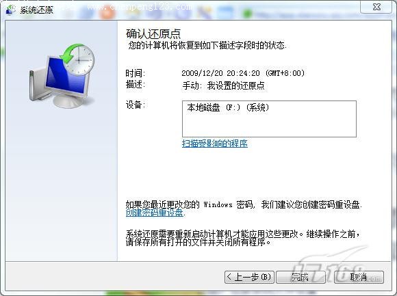 选择后还原点后,最后经过一个确认步骤,剩下的就又系统还原功能自动完成了,还原、重启、完成,过程如同Windows XP一样,很快你就可以重新见到没有问题的系统了。