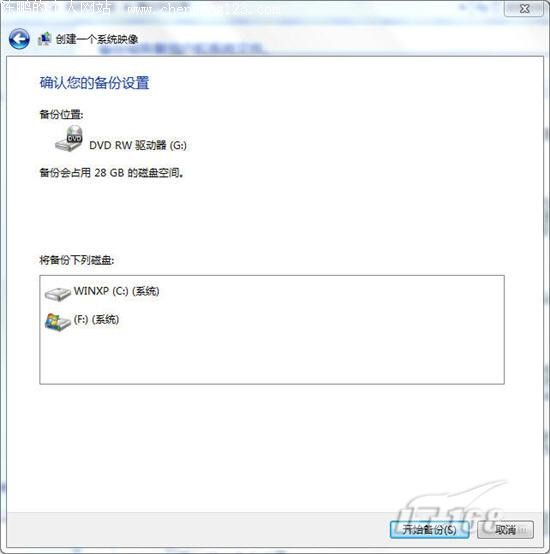 点击“下一步”按钮进入确认备份设置界面,我们可以看到要备份磁盘显示在列表中。因为本人的电脑安装的是双系统,所以这里系统映象功能自动对Windows XP存在的C盘和Windows 7存在的F盘进行备份。点击“开始备份”按钮就会开始备份的进程了,整个过程并不会耗费过多时间,大概在10分钟左右。