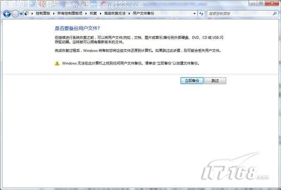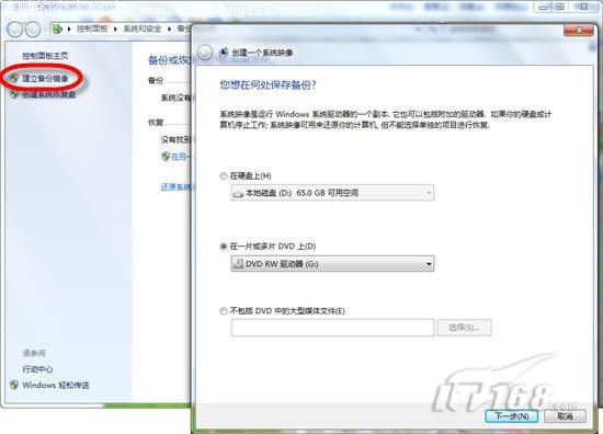 打开开始菜单,依次点选“所有程序”→“维护”→“备份和还原” 。在打开的“备份和还原”功能窗口中,点击左侧的“建立备份镜像”开始创建一个系统映象。首先是选择保存备份的位置,可以是硬盘分区、DVD盘片和网络位置,需要注意的只有NTFS的磁盘分区才可以保护备份文件。