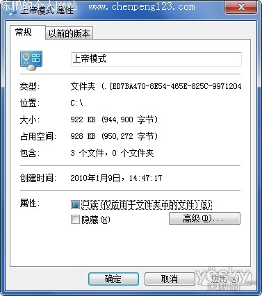 首先笔者将包含一个.txt文档、一张.jpg图片和一个.exe程序的文件夹命名为“上帝模式.{ED7BA470-8E54-465E-825C-99712043E01C}”。这时双击文件夹,打开的是“上帝模式”的文件夹,并且上述文件都无法显示。但是此时查看文件夹属性,仍然能够看到文件夹的大小和包含的文件数量(如图3所示)。