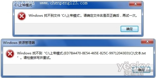 接下来笔者再将这个文件夹改名,不过此时无论怎么改,双击这个文件夹始终都是进入“上帝模式”,无法看到里面的文件了。然后笔者又尝试在地址栏直接输入这个文件夹的地址,如“C:\上帝模式”和“C:\上帝模式.{ED7BA470-8E54-465E-825C-99712043E01C}”,都只能打开“上帝模式”。而在“运行”中输入“C:\上帝模式”会报错,输入“C:\上帝模式.{ED7BA470-8E54-465E-825C-99712043E01C}”也是打开“上帝模式”。如果在运行和地址栏直接输入“上帝模式”文件夹中的文件名,也就是文件的完整路径,如“C:\上帝模式.{ED7BA470-8E54-465E-825C-99712043E01C}\网络工具.exe”也无法运行其中的文件(如图4所示)。