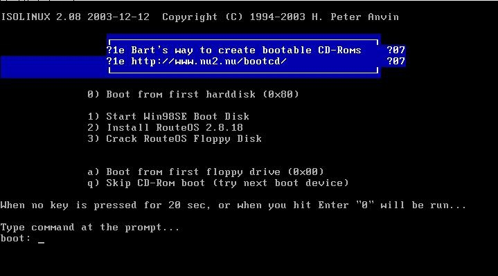 准备工作: 1、光盘刻录机一台。一张刻录碟(实在没有的朋友就将就用GHOST破解版的吧) 2、破破烂烂的机器一台~ 3、三块网卡8139-530随便你 4、1G以上的硬盘硬盘空间 软件要求: routeros的任何版本 http://www.router.net.cn 有ISO的破解镜像,也有GHOST破解版本 RouterOS 2.8.18安装图文教程 只是安装过程。一直安装到可以用winbox控制为止。 解包后将包内的Ros01.iso刻录成可引导光盘。机器的硬盘设置为IDE0,即第一IDE通道的主盘。 bios设置光盘引导系统,放入光盘启动机器得到如下画面
