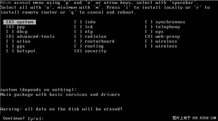 图1 选择 2:Install RouteOS 2.8.18后稍等,得到如下画面: 用方向键和空格选择你需要的模组功能后,按“I”键确定安装。会再次询问你继续?yes or no?,按“Y“