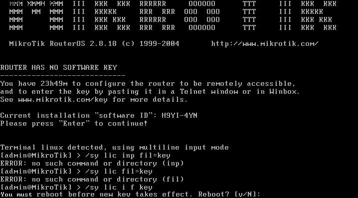 图3 重新启动后开始登陆。初始用户名admin,初始密码为空。 咦?怎么还有提示注册的信息和Soft ID? 原来是还需要一个命令激活注册补丁才可以哦: 输入命令:/system license import file-name=key 或者缩写为/sy lic i f key 然后提示你是否重新启动。按Y重新启动