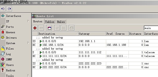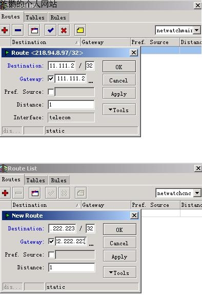 图19 再增加两条路由表,netwatchmain(如图20):目标地址111.111.111.112/32,网关为111.111.111.112;netwatchcnc:目标地址222.222.222.223/32,网关为222.222.222.223(如图21)。当两线线其中一条挂掉时,通过这两条路由表可以制定两条规则,强制电信与网通网关使用这两条规则,令两条线之间可以自动切换。