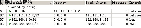 图15 要注意的是,配置用于外网连接的两张网卡时,设置的默认网卡必须与内网网卡配置的相同,不然设置完成后,在“IP——ROUTERS”查看时会看到两个“IS”(如图16),这表示你为三张网卡配置了三个不同网卡。此时可以使用工具栏上的“-”按钮来删除两个失效的IS。完成后,列表中图17所示。
