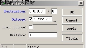图18 按一下“+”按钮,配置刚才建立的网通路由表。Destination是目标网络的意思,保留设置;网关Gateway则设为网通的网关:222.222.222.223