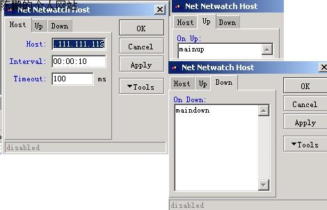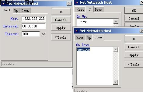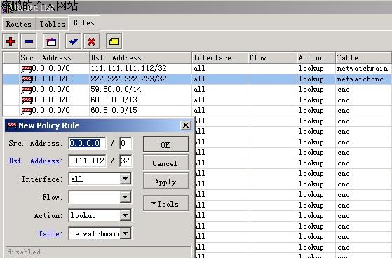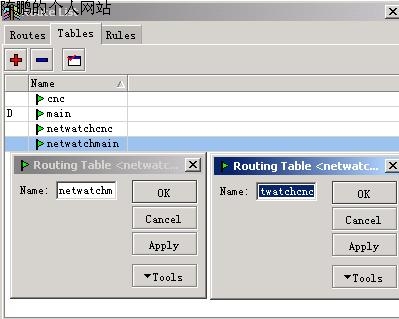 图31 Netwatch的作用其实就是监视网络通不通。当检测发现网通的线不通时,自动切换使用电信的线,反之亦然。另外,Netwatch也会监视挂了的那条线,看它什么时候能恢复,一旦恢复立即将切换回来。所以最后在路由规则里添加两条规则,Tabel栏里分别选择之前建立路由表netwatchmain与netwatchcnc,目标地址与网关分别按这两个路由表来设置。建立这两条规则后,两条宽带线任何一条挂掉后,这两条规则可以保证两条线间的自动切换,保证网路的畅通。