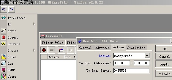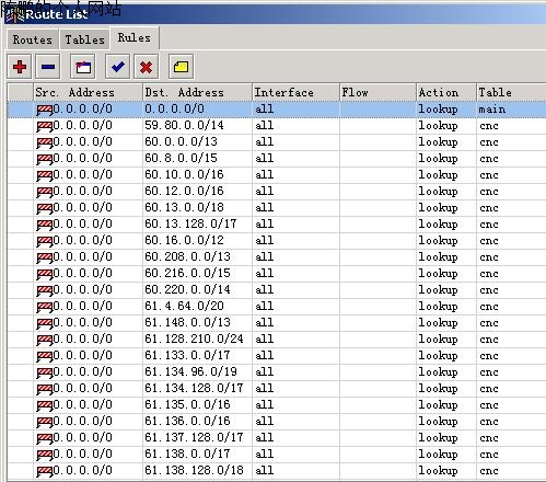 图23 建立好的rule规则里只有一条main路由表,比较它与其他网通的网段是否相同,若是相同的话,则可以直接使用网通的网关,main路由表也不必删除。不相同的话,则表示它是电信或其他的数据包,必须删除第一条main路由表。 共享上网与IP伪装 选择IP——Firewall——SNAT,使用“+”添中一条规则,然后要打开的窗口中选择“Action”,如图22设置。只要内外网关配置没有错误的话,策略路由就配置完成了。