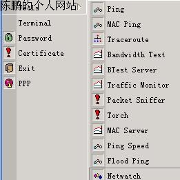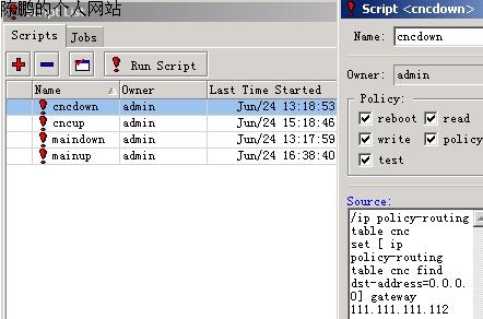 图24 脚本的备份 选择“SYSTEM——SCRIPTS”,添加四条脚本: cncdown /ip policy-routing table cnc set [ ip policy-routing table cnc find dst-address=0.0.0.0] gateway 111.111.111.112 脚本说明:当网通挂了,把其网关设置为电信的111.111.111.112