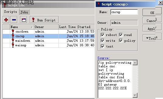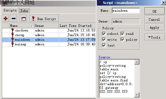 图25 maindown / ip policy-routing table main set [ ip policy-routing table main find dst-address=0.0.0.0] gateway 222.222.222.223 脚本说明:当电信挂了,把其网关设置为网通的网关 222.222.222.223