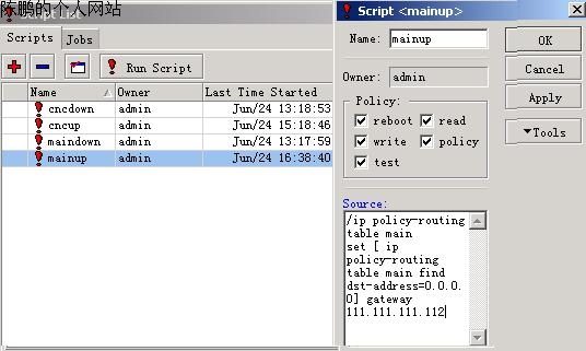 图27 mainup /ip policy-routing table main set [ ip policy-routing table main find dst-address=0.0.0.0] gateway 111.111.111.112 脚本说明:当电信工作正常时,将其默认网关自动还原成原来网关111.111.111.112