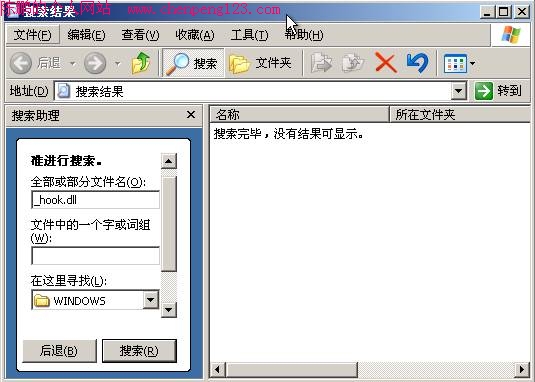 2、打开Windows的“搜索文件”,文件名称输入“_hook.dll”,搜索位置选择Windows的安装目录(默认98/xp为C:\windows,2k/NT为C:\Winnt)。