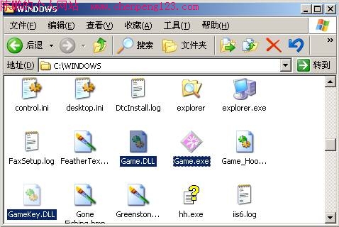 4、根据灰鸽子原理分析我们知道,如果Game_Hook.DLL是灰鸽子的文件,则在操作系统安装目录下还会有Game.exe和Game.dll文件。打开Windows目录,果然有这两个文件,同时还有一个用于记录键盘操作的GameKey.dll文件。
