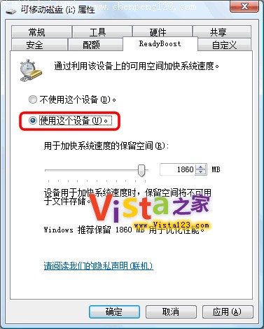 ReadyBoost功能利用了优盘的高速随机访问能力,让U盘(优盘)作为Windows Vista的SuperFetch缓存,从而让Windows Vista获得比较好的性能。尽管ReadyBoost的原理说起来比较复杂,但是操作却很简单。只要把优盘插入USB接口,Windows Vista立即会弹出一个“自动播放”对话框,如果优盘符合ReadyBoost要求,就会出现一个“加速我的系统”选项,单击“加速我的系统”选项,即可出现“ReadyBoost”属性,选中“使用这个设备”选项,然后拖动滑块指定ReadyBoost所占用的优盘空间。