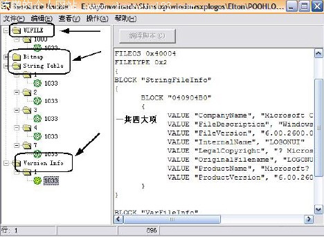 二、用ResHacker打开logonui.exe文件。现在我们可以开始动手制作我们自己的XP登录界面了。在ResHacker中我们可以看到有UIFILE,Bitmap,String Table,Version Info四大项。我们要修改的就是这几项。