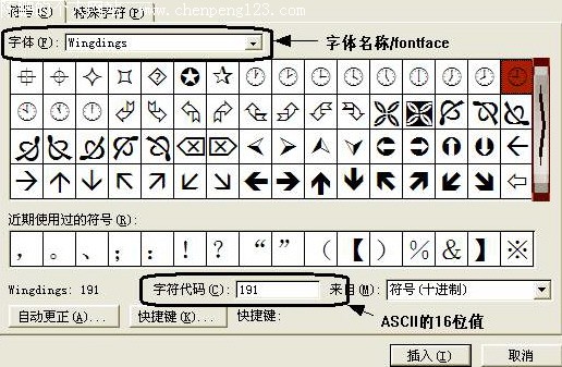 这是什么符号呢,你试过就知道了。一个简单的找出字符ASCII-hex值的方法是使用微软的Word,或者任何一种字处理软件如wps office,选择“插入”-->“符号”,然后在弹出的对话框中选择一种字体,选择某个你喜欢的符号,注意下面字符代码中的值,按此改变即可。另外要注意使用unicode字体,以免别人的机子上没有定义的字体。