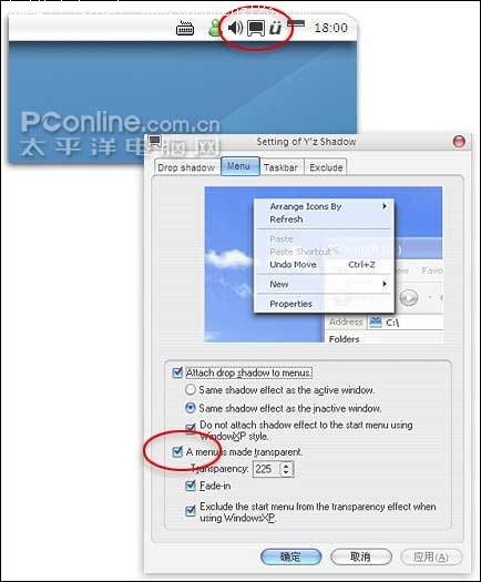 要打开FlyakiteOSX的透明特效其实也很简单,只要我们在系统托盘的“Y’z shadow”图标上右击,执行“Setting”命令。然后,在弹出的对话框中切换到“Menu”标签。最后,勾选“A menu is made transparent”复选框,再从“Transparency”中选择一个合适的透明度就可以了,如图14所示。
