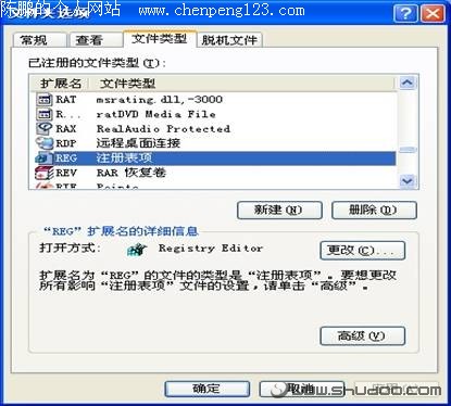打开任一个浏览器窗口,如打开“我的电脑“窗口”,选择“工具”菜单下的“文件夹选项”命令,在弹出的对话框中选择“文件类型”选项卡,选中扩展名为REG的注册表项,在详细信息中指明的默认打开方式为Registry Editor(如图)。