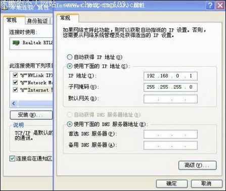 四、开始→设置→网络连接→右击“本地连接”→属性→双击“Internet协议(TCP/IP)”→如果IP地址为空的话,点“使用下面的IP地址”指定IP地址和子网掩码。如可以将IP地址设为192.168.0.X(X为1-255之间任一值),子网掩码可设为255.255.255.0→确定→确定。