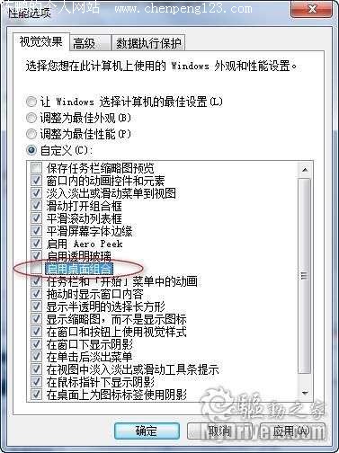 最后,在“视觉效果”标签下,取消系统默认勾选的“启用桌面组合”。如图3