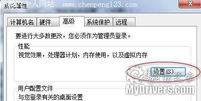 在弹出的对话框中切换到“高级”选项,单击“性能”区域内的“设置”按钮。如图2