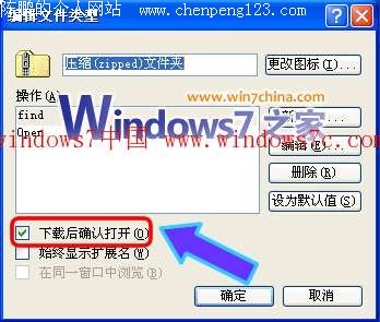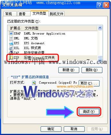打开“控制面板”中的“文件夹选项”,在打开的窗口中单击切换到“文件类型”选项卡后,单击选中列表中的ZIP或RAR等文件,如下图: